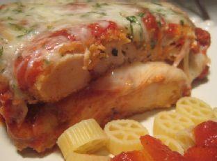 Step 4 : Remove the chicken to a baking sheet. Finish the chicken in the 350 degree oven for 10-15 minutes. {Depending on how thick your chicken breasts, add more or less time.}In a large pot, boil the water needed for your pasta. We used angel hair which only takes 3-5 minutes to cook. But if youre using a penne or something denser youll need more time for the pasta.Pull the chicken out and top with mozzarella cheese, put back into the oven to melt the cheese.Plate the pasta first, topped with chicken and the cover with sauce. If youre feeling zesty add a little fresh shaved Pecorino-Romano or grated Parmesan cheese!