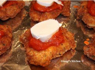 Step 2 : Heat vegetable oil in a large skillet over medium-high heat.In a small sauce pan, warm your pasta sauce.Lightly beat 1 egg in a bowl. Put about 1 cup of bread crumbs in another bowl and season with a little garlic powder. Take your floured chicken and dip into the egg wash, coating all over, then into the bread crumbs. Bread all four chicken breasts.